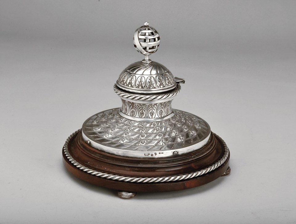 - recipiente em vidro, base em madeira, contraste Javali de Lisboa (1887-1937), marca de ourives de LEITÃO & IRMÃO