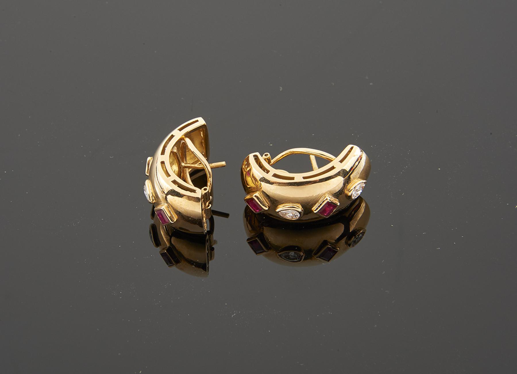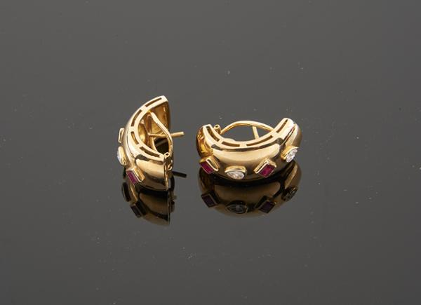 - cravejados com 2 rubis e 5 diamantes em talhe gota com o peso aproximado de 0,60 ct.,