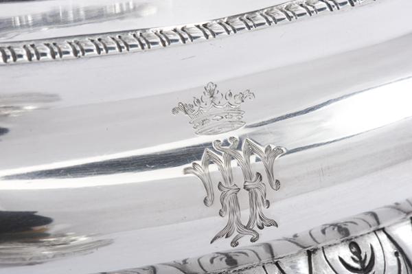- decoração gravada com monograma T encimado por coroa de marquês, pés relevados "Conchas", pega de pau-santo