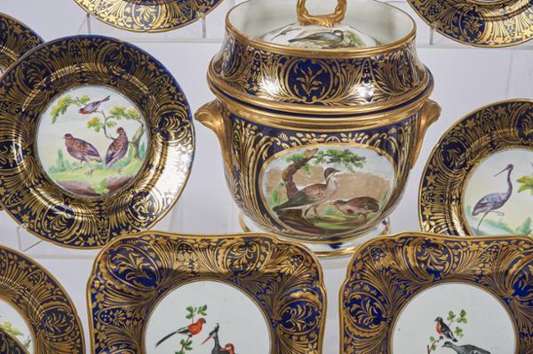 - decoração a azul e dourado, centros policromados "Aves", composto por «Ice-Pail», três covilhetes e 12 pratos