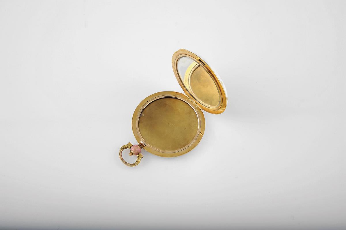 - decoração guilhochada com esmaltes cor-de-rosa e branco, interior com espelho