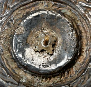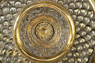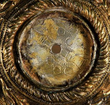 de um elemento provavelmente esmaltado original, recorda corais, um pouco como surgem depois nos portais da igrejas manuelinas. Já a larga aba com ornamentação ritmada, mesmo geométrica, de motivos de inspiração em frutos e folhagens , tecendo um efeito de espiral através do jogo entre superfícies gravadas e polidas, comprova o conhecimento do novo estilo clássico. Sem dúvida que este exemplar se encontra nos primeiros exemplos da ourivesaria renascentista entre nós. Embora com linguagem ornamentais contrastantes entre o medalão central e a aba , o equilíbrio visual foi perfeitamente alcançado.