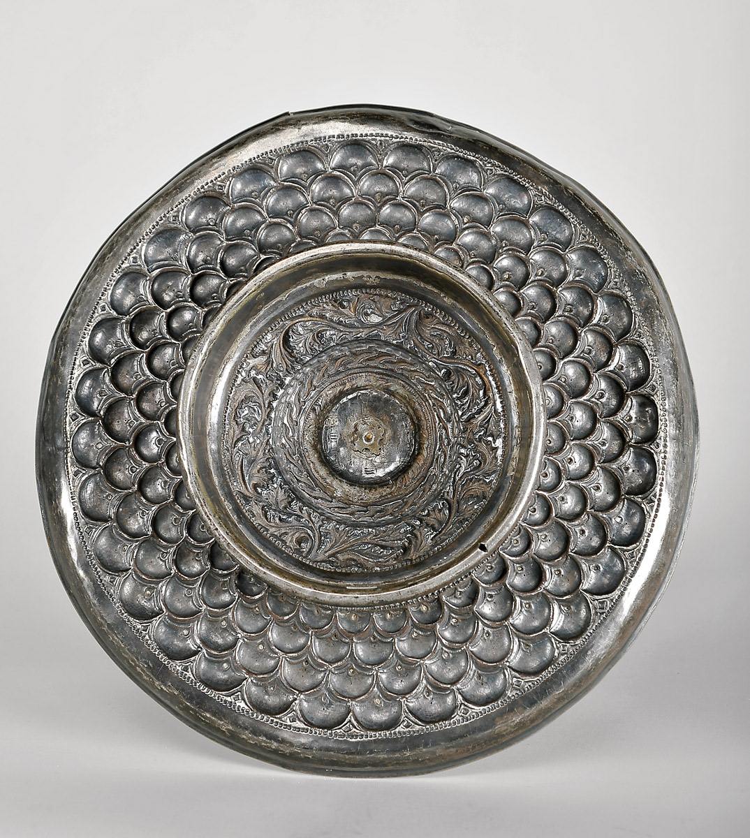 Medalhão central, atarrachado ao prato, é constituído por uma roseta emoldurada numa cordinha e envolvida num friso de troncos encanastrados e uma faixa de cardos ondulantes".