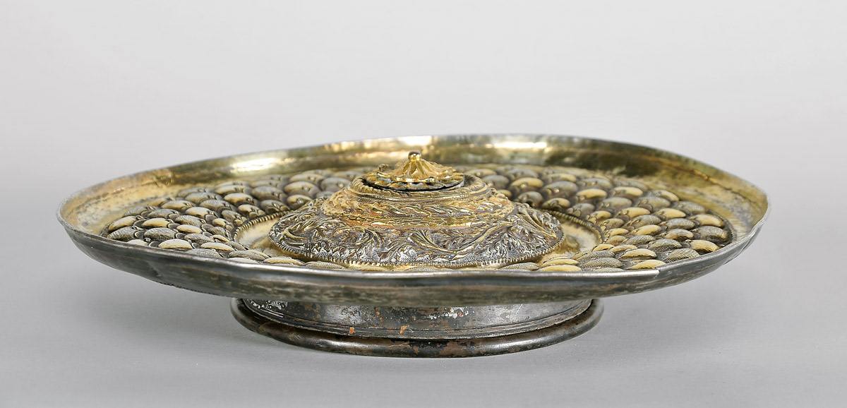 "A Transição do gótico tardio para o Renascimento não foi realizada de modo imediato na ourivesaria portuguesa, como em qualquer outra manifestação artística. na realidade demorou dédacas com a introdução gradual de novos elementos "ao Romano", quase sempre mal entendidos, em obras concebidas ao modo tradicional. Esta salva de pé baixo, e consideráveis dimensões, é de tal um bom exemplo. Destaca-se pelo seu medalhão central elevado com dois