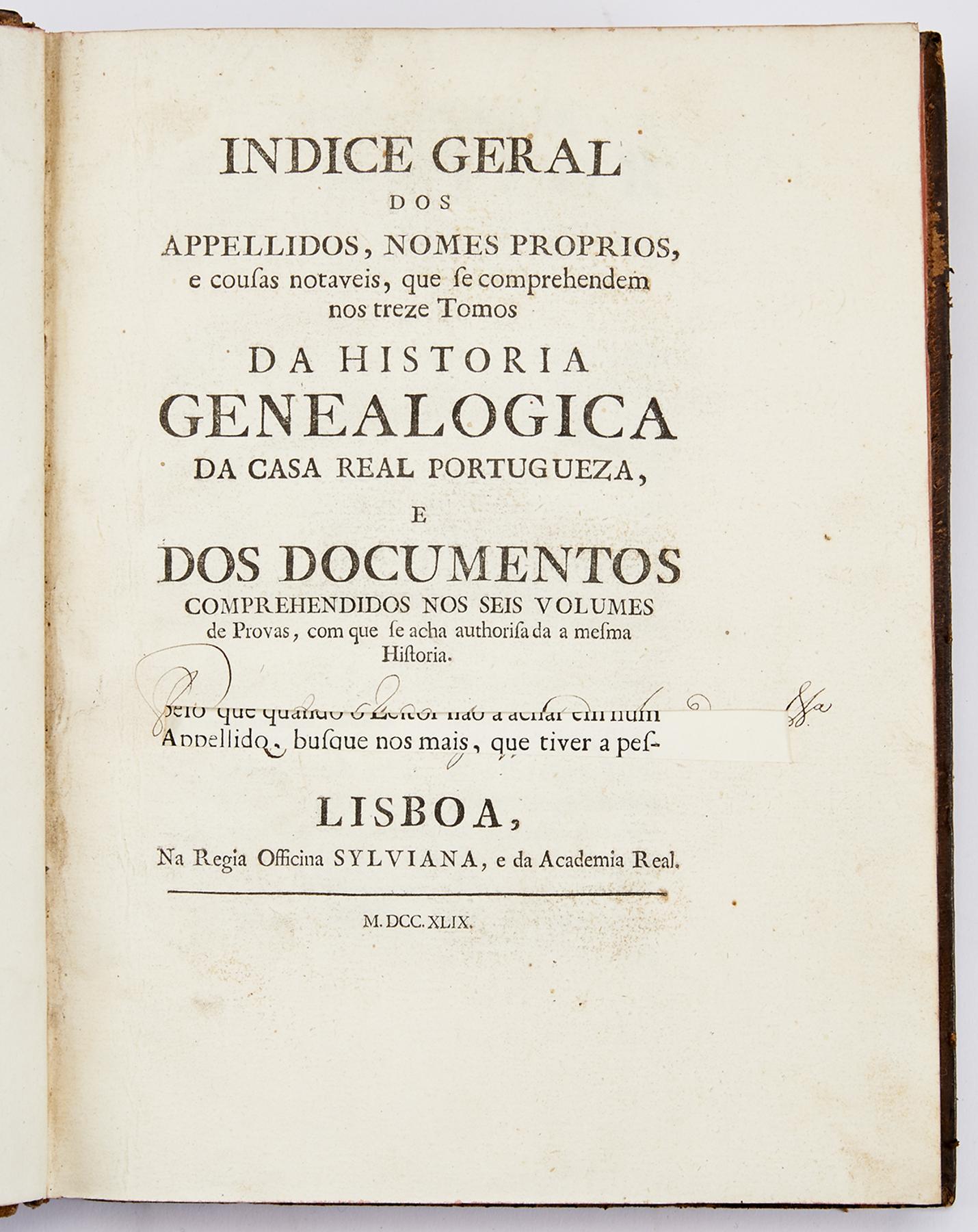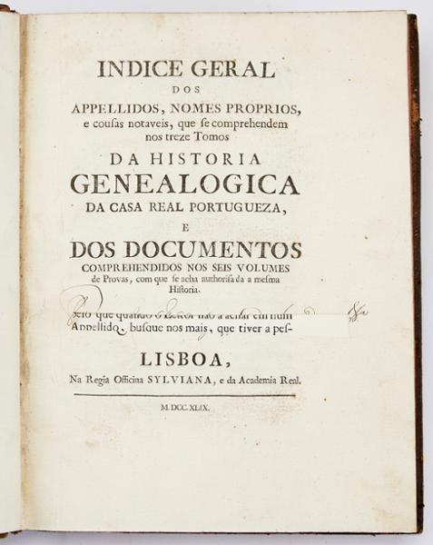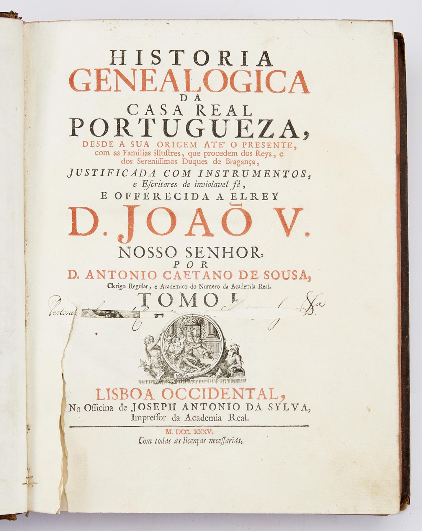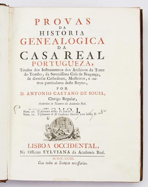 - SOUSA, D. António Caetano de.- Historia genealogica da Casa Real Portugueza, desde a sua origem até o presente, com as familias illustres, que procedem dos Reys, e dos Serenissimos Duques de Bragança.- Lisboa Occidental: Na Officina de Joseph Antonio da Sylva, 1735-1749.- 20 vols.: il.; 29 cm.- E.