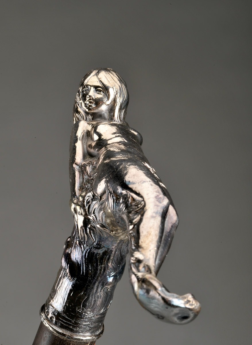 - A Cane,◙Art Nouveau, Brasilian rosewood,◙relief silver handle "Nude female figure", Europe,◙marked