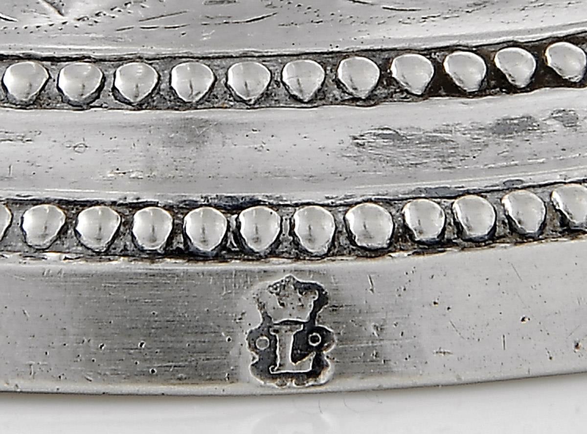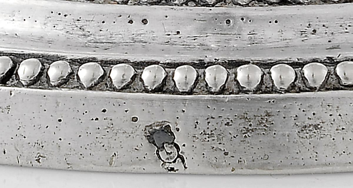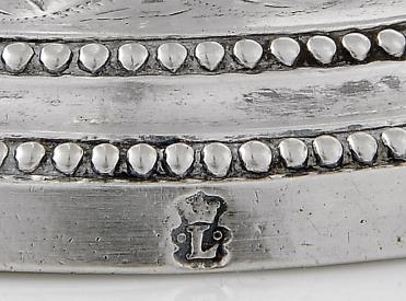 - decoração gravada "Laços e grinaldas", marca de ensaiador de Lisboa (1790-1804), marca de ourives de João Gonçalves Ribeiro ou de Joaquim Gaspar dos Reis (770-1822)