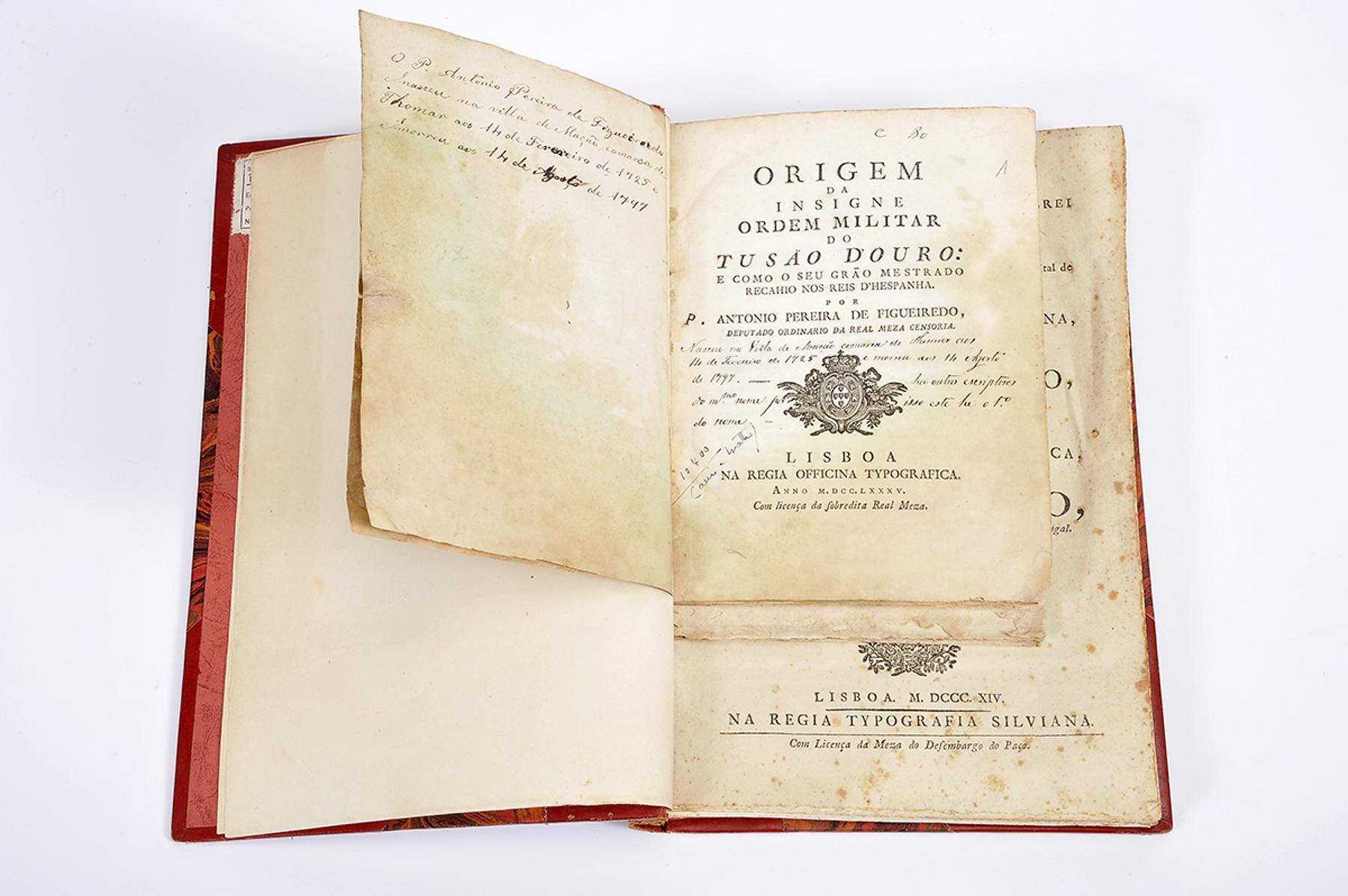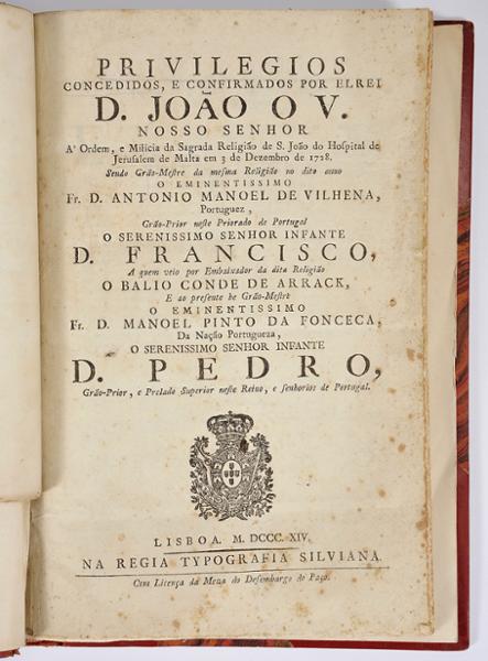 1 - Origem da Insigne Ordem Militar do Tusão d'Ouro: e como o seu grão mestrado recahio nos Reis d'Hespanha / Pe. António Pereira de Figueiredo.- Lisboa: na Regia Officina Typografica, 1785.- 41 p.; 21 cm.; 2 - Notícia curiosa da instituição da Nova Ordem Militar de Cavalleria da Torre, e Espada, estabelecida pelo Principe Nosso Senhor.- Lisboa: Na Impressão Regia, 1809.- 6 p.; 22 cm.; 3 - Discurso sobre o voto de castidade que professaõ os freires conventuaes da Ordem Militar de S. Tiago da Esapada... / por D. Jozé Manoel da Camara.- Lisboa: Na Offic. de Antonio Rodrigues Galhardo, 1817.- 37 p.; 22 cm.; 4 - Privilegios concedidos, e confirmados por ElRey D. Joaõ V. Nosso Senhor à Ordem, e Milicia da Sagrada Religiaõ de S. João do Hospital de Jerusalem de Malta em 3. de Dezembro de 1728...- Lisboa: Na Regia Typografia Silviana, 1814.- 30 p.; 28 cm.;