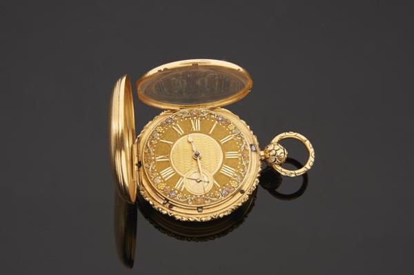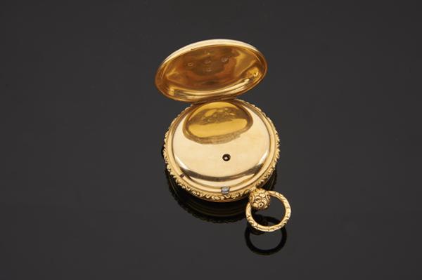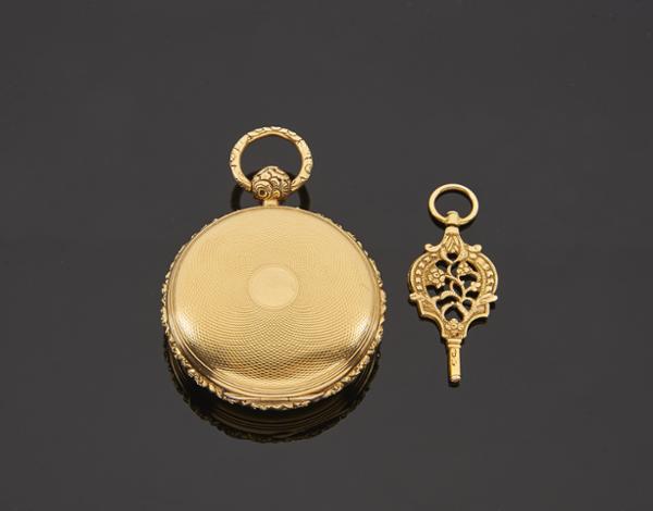 - decoração gravada e guilhochada, movimento mecânico, com chave em ouro de 585/1000 vazado, marca de ensaiador e de ourives de Lisboa