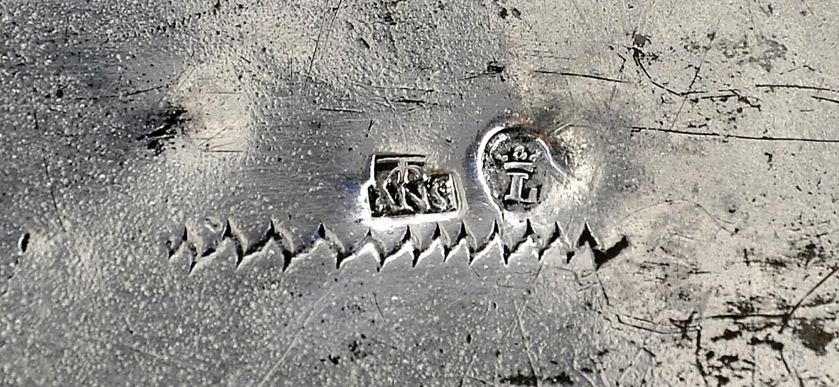 - decoração gravada, marca de ensaidor de Lisboa (1804-1810), remarcado com marca de ourives atribuível a Agostinho Nunes da Silva (ou de Sousa) (1770-1804)