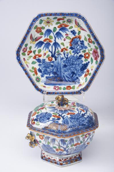 - decoração a azul, rouge-de-fer e dourado "Jardim com flores", pegas e pomo da tampa relevados "Cães de Foo",