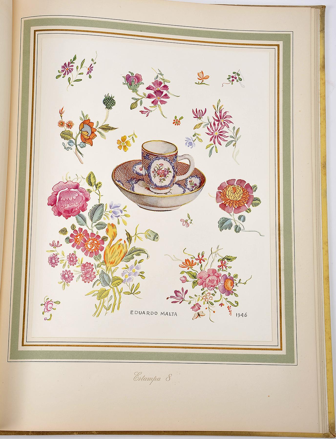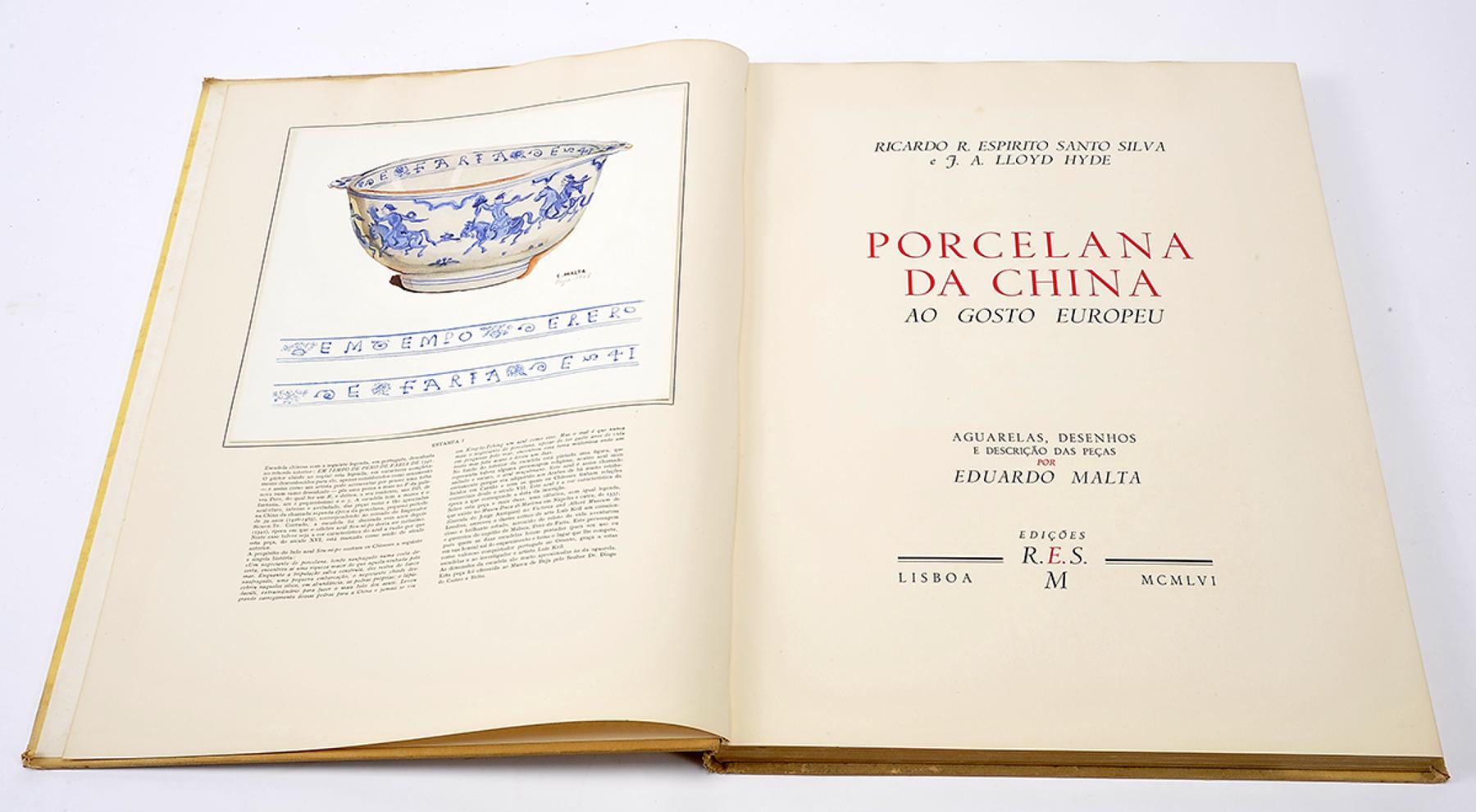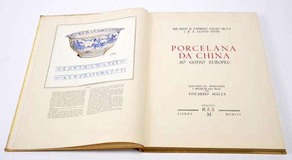 - SILVA, Ricardo Espírito Santo; HYDE, J.A. Lloyd.- Porcelana da China ao gosto europeu / aguarelas, desenhos e descrições das peças por Eduardo Malta.- Lisboa: Edições R.E.S., 1956.- 119 p.: il., XXXVI, 8 estampas color.; 47 cm.- E. Edição limitada a 350 exemplares numerados e assinados por Eduardo Malta, sendo este o nº 182. Para além de numerosos desenhos no texto, inclui 45 estampas em tetracromia, sendo 8 no final e as restantes coladas no texto. Exemplar revestido da encadernação original, em tela amarela, um pouco empoeirada, sem a sobrecapa.