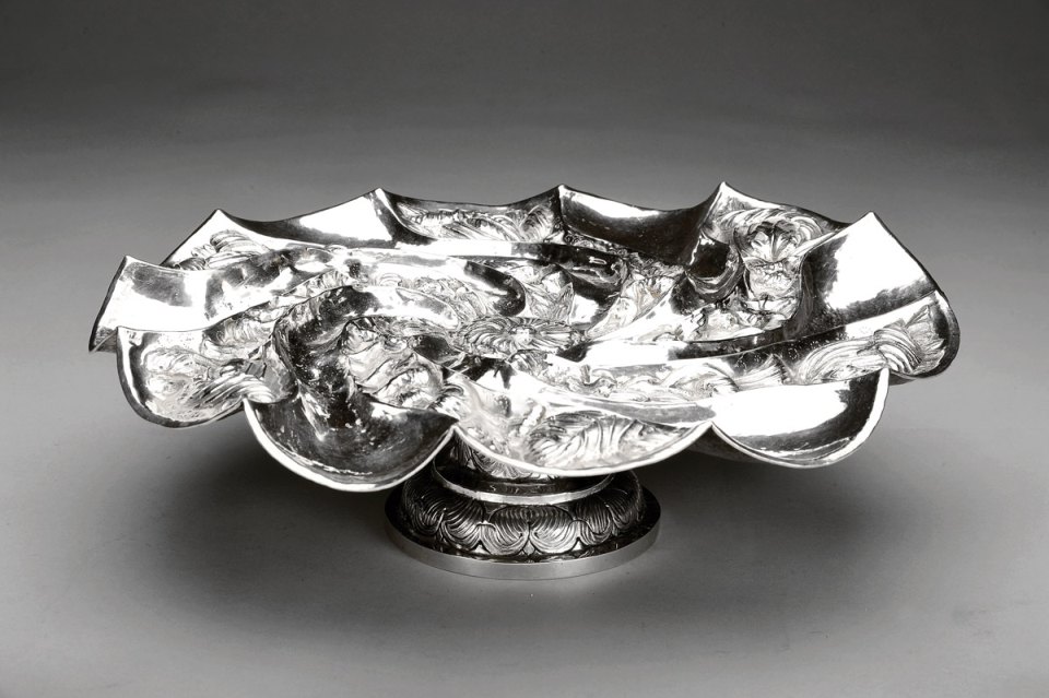 - decoração gravada e relevada "Ramagens de flores", pé com marca de ensaiador de Guimarães e marca de ourives E