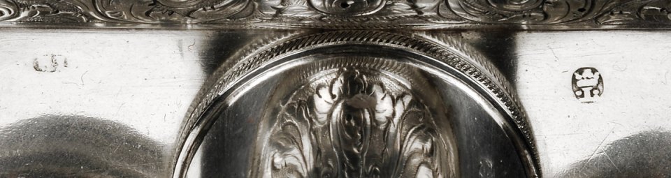 - decoração gravada "Folhagens", composto por suporte de pena, campainha, tinteiro e areeiro, marca de ensaiador de Lisboa (1843-1870), marca de ourives ilegível