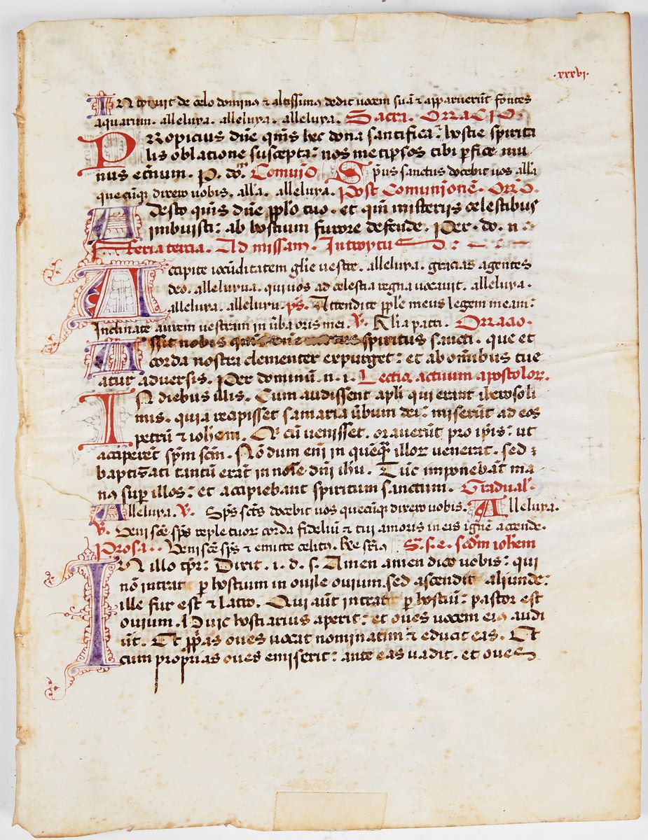- Manuscrito sobre pergaminho, de uma só mão, em letra gótica a preto, azul e vermelho. Fólio xxxvi de um livro litúrgico, provavelmente um Breviário Ibérico, do final do século XV, contendo 31 linhas, tanto na frente como no verso, e um total de 14 iniciais filigranadas. Alguma acidez, causando ocasional corrosão do suporte em 4 ou 5 linhas. Emoldurado, com vidro duplo.