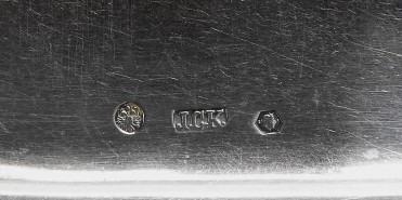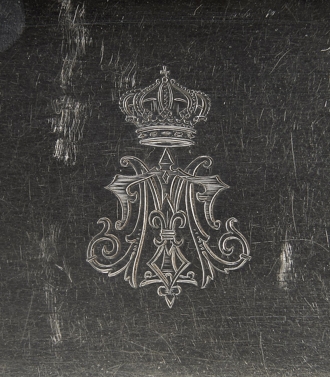 - decoração gravada com monograma MA encimado pela coroa real portuguesa - D. Manuel II e Dona Augusta Vitória, marca da cidade de Viena (1876-1922), marca de ourives de Josef Carl Klinkosch (1844-1884), composto por espelho de mesa, frasco, duas caixas cilíndricas, caixa rectangular e bandeja pequena