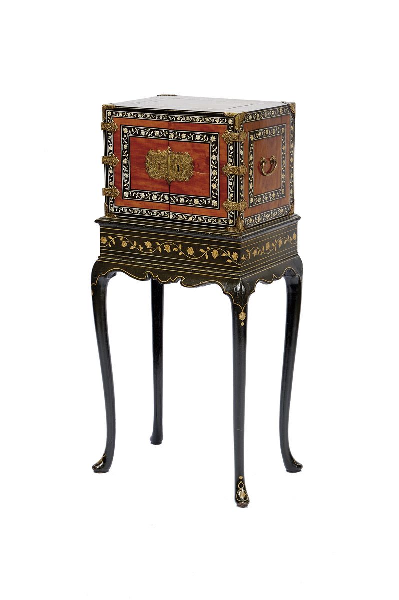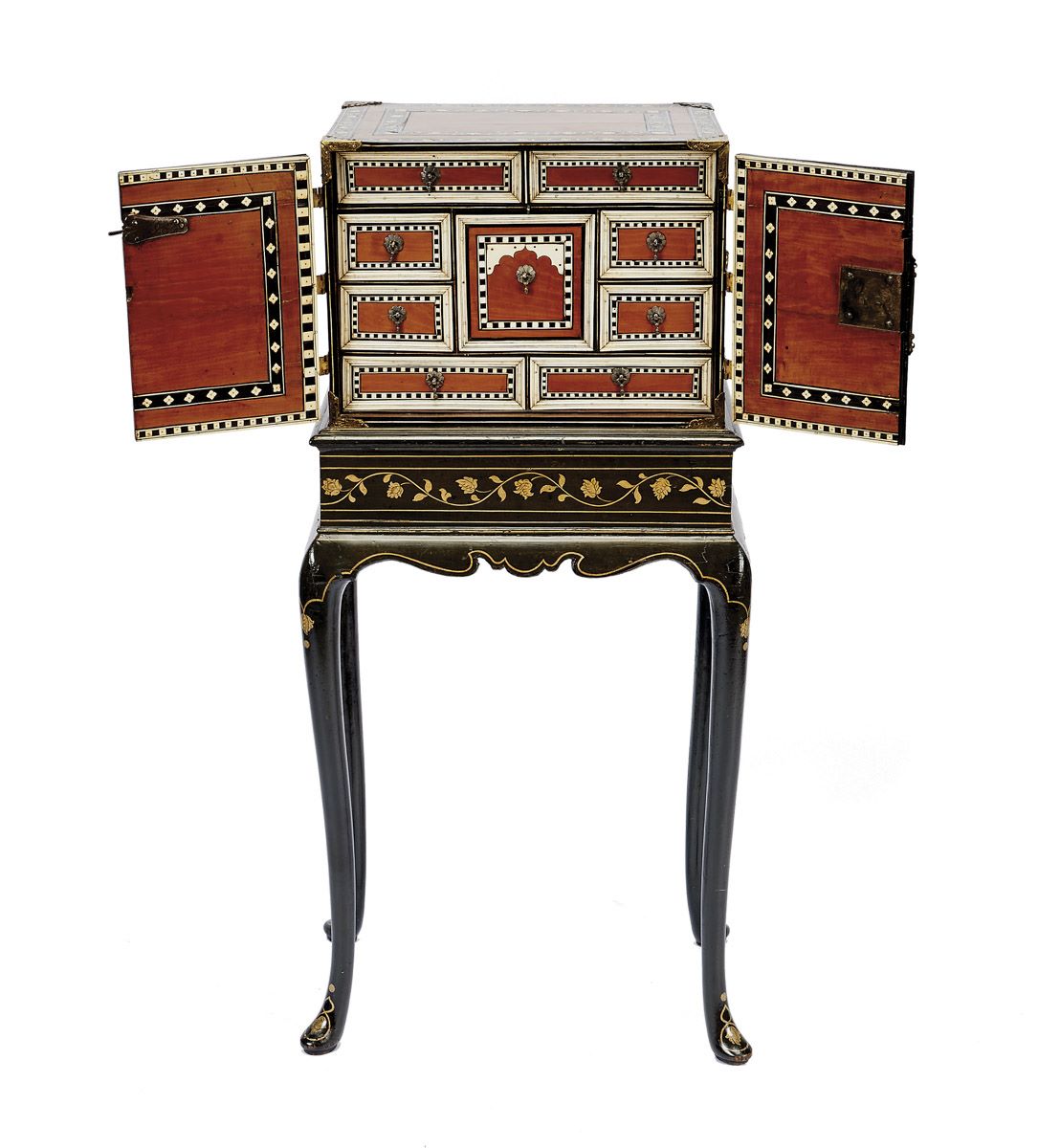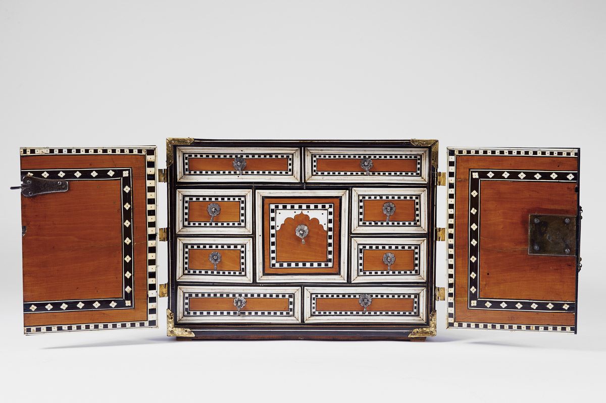 - interior com nove gavetas tendo a central um arco de feição islâmica, ferragens em cobre recortado,