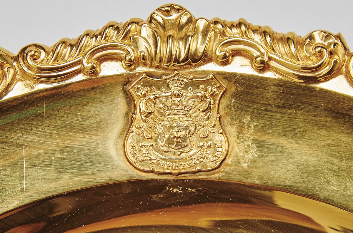 - aplicação de armas de família e mote "SODIM OPPONEBAT UTIS", marcas da cidade de Viena (1859 e de 1872-1822), oito com marcas de ourives de SCHWARTZ & STEINER