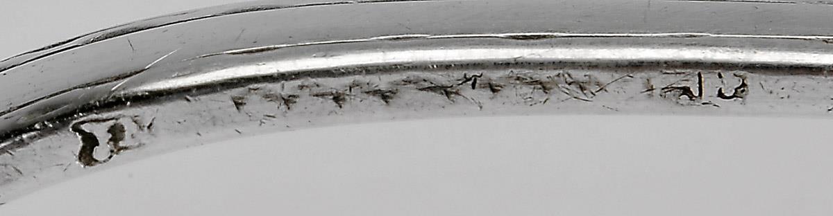 - decoração relevada e gravada, marca de ensaiador de Lisboa (1790-1795), marca de ourives de Joaquim Nunes Colares (1770-1804)