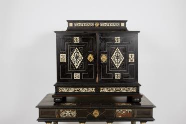 - marchetaria de ébano, madeira ebanizada e marfim "Flores, enrolamentos e mascarões"