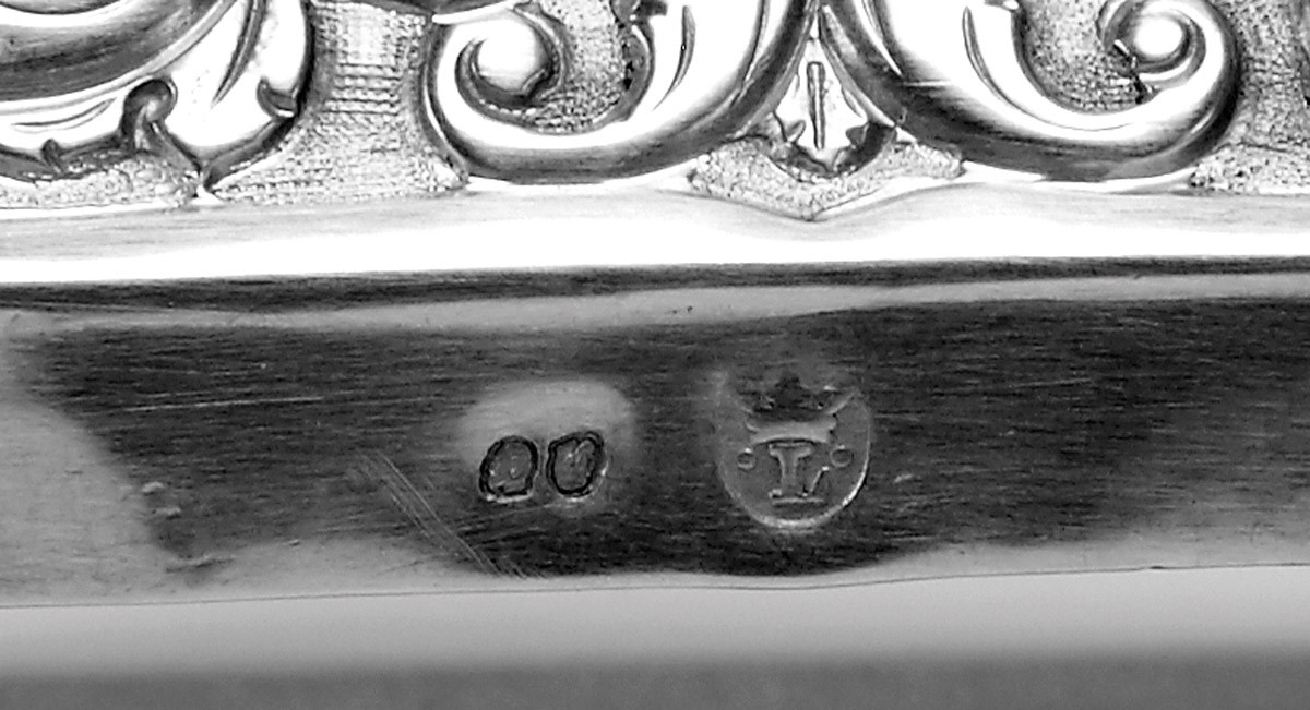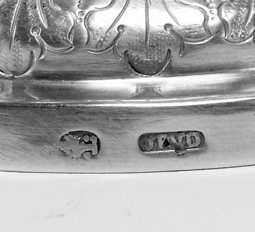 - base com decoração gravada, marca de ensaiador de Lisboa (1843-1870), marca de ourives de Joaquim Prudêncio Vital Dinis (1812-1879)