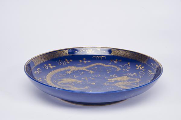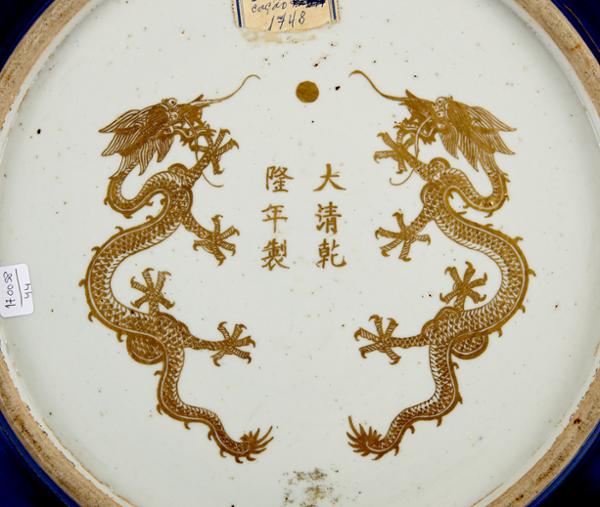 - decoração a dourado sobre fundo azul "Dragões", verso com decoração a dourado "Dragões e morcegos"