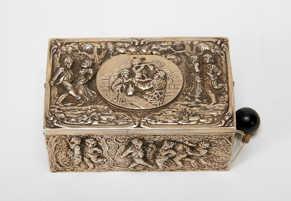 - decoração relevada "Festa - tocando e dançando", sistema de corda com tampa elevatória mostrando no interior chapa de metal rendilhada e dourada com autómato de ave