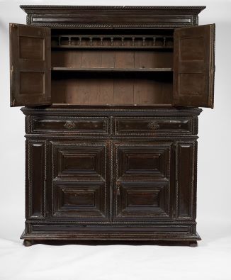 - frisos torcidos e paineis almofadados, interior do corpo superior com galeria, ferragens em ferro