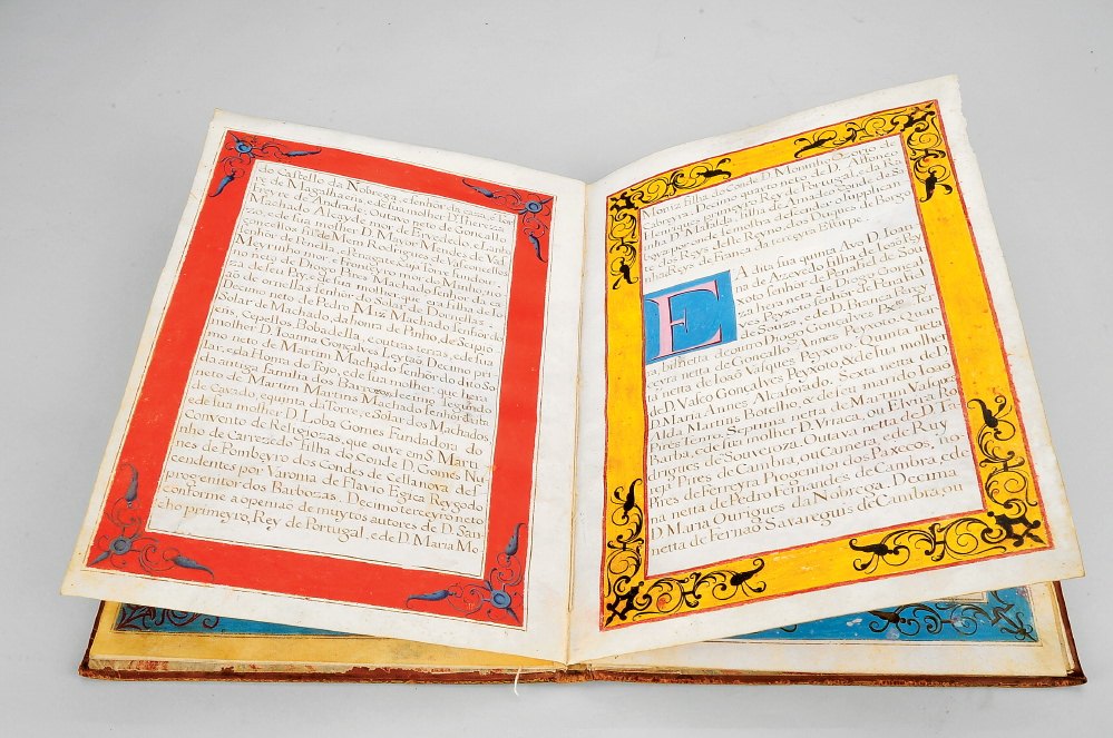 Manuscrito sobre pergaminho, caligrafado e iluminado. Todos os fólios apresentam molduras pintadas com motivos e cores diferentes, na frente e verso (o último apenas na frente); uma grande inicial (D[om] Ioao) pintada e filigranada e mais oito capitulares pintadas. Na frente do sexto fólio, as armas do requerente, com a respectiva descrição na página oposta: escudo esquartelado com as armas dos Machados, Câmaras, Pereiras e Silvas, elmo e paquife. Na frente do último fólio, o termo de encerramento: dado em Lisboa, aos doze dias do mês de Maio do ano de 1745. Assinaturas autógrafas: Hilário da Costa Barreyros, (escudeiro e escrivão da nobreza) - P. Rey darmas Pal. [Manuel Pereira da Silva, Principal Rei darmas Portugal]. No verso, dois registos no Livro dos Brasões da Nobreza de Portugal, e no Livro do Registo do Senado da Câmara. Manuscrito com ligeiro manuseamento e alguns sinais de abrasão. Encadernação da época, inteira de carneira, um pouco cansada (falta dos atilhos de seda e das guardas volantes), com roda em esquadria nos dois planos idênticos e rectângulo central com pequeno florão