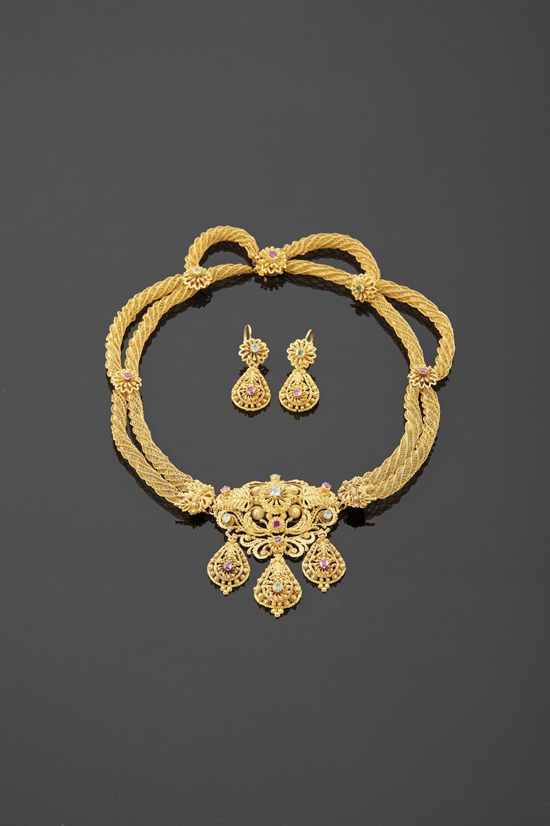 - malha e filigrana de ouro (18 kt.), cravejado com 9 esmeraldas e 10 rubis forrados, contraste de Caen (1781-1790)
