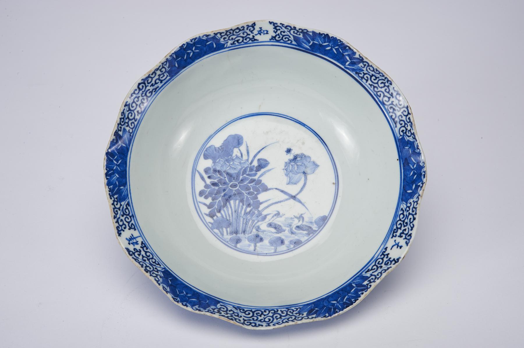 - decoração a azul "Paisagem oriental com figuras", reserva central "Jardim com patos, flores e cogumelos"