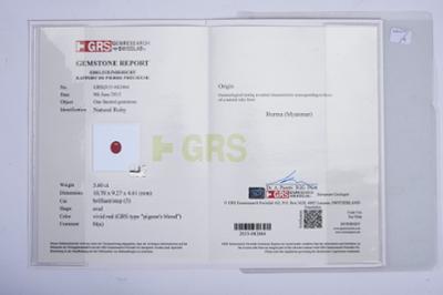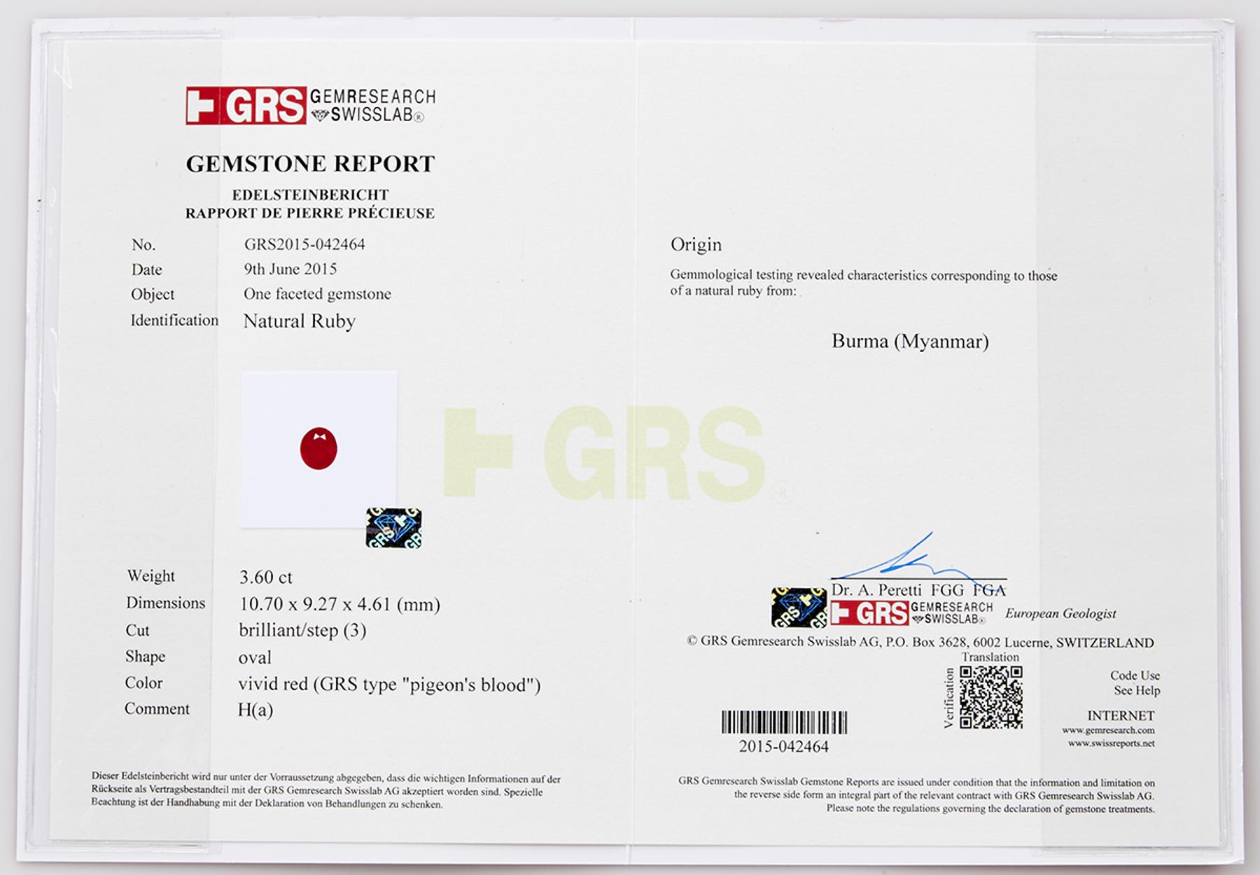 - cravejado com 6 diamantes com o peso aproximado de 0,18 ct. e um rubi de Burma em talhe oval com o peso de 3,60 ct.
