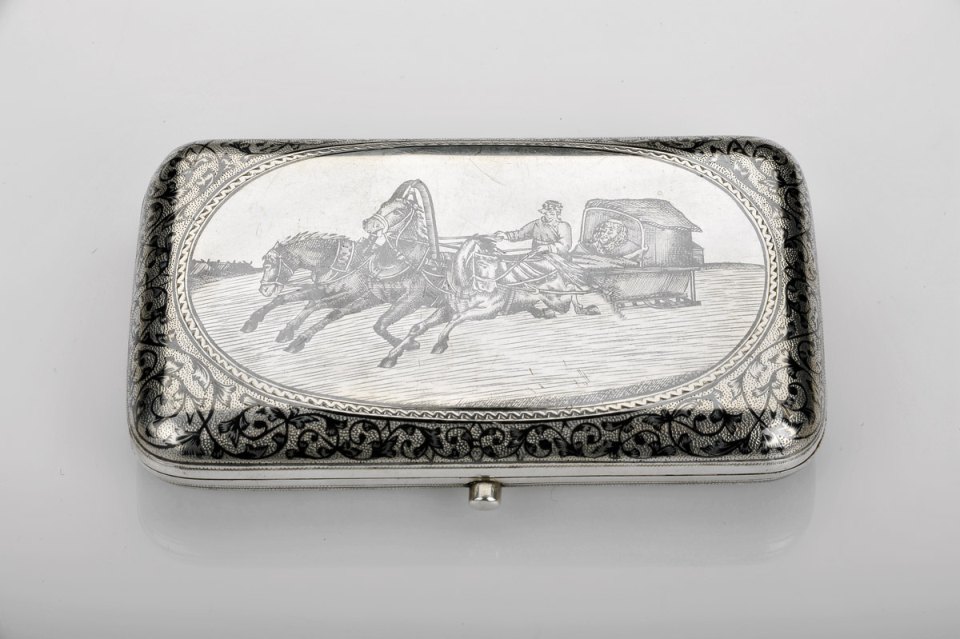 - A Cigarette case, silver, niello decoration “Landscape with