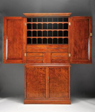 - interior do corpo superior com gavetas, escaninhos e porta, interior do corpo inferior com prateleira