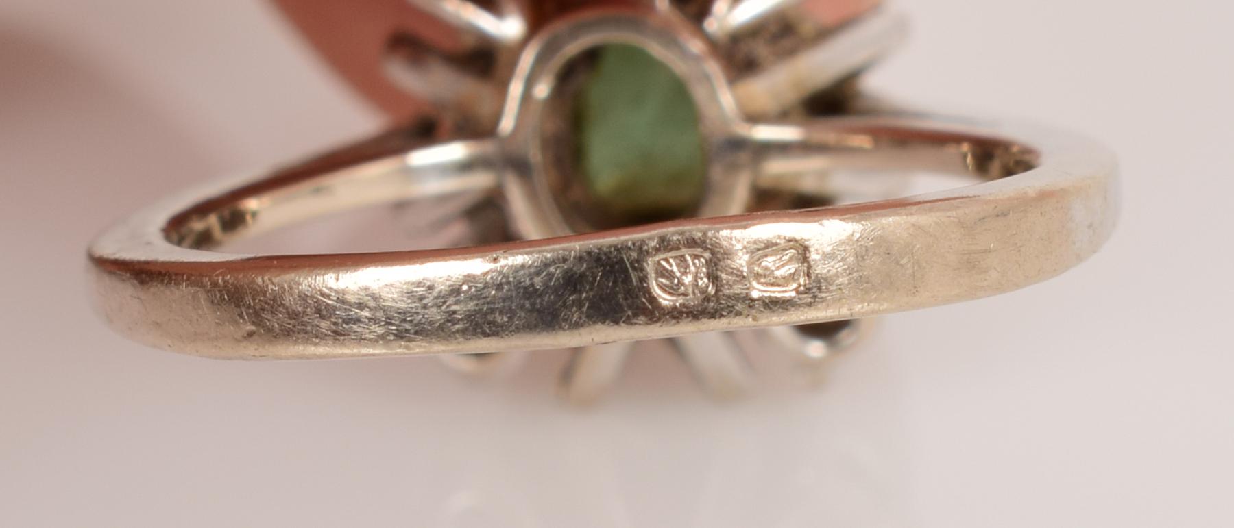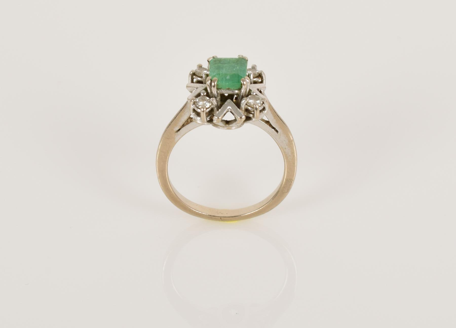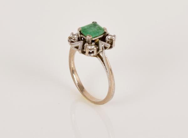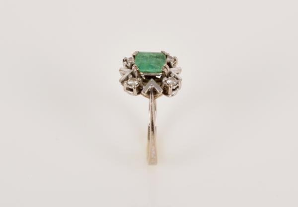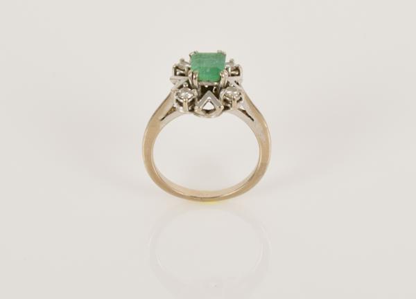 - cravejado com esmeralda com o peso aproximado de 0,70 ct. e quatro diamantes em talhe de brilhante com o peso aproximado de 0,08 ct.