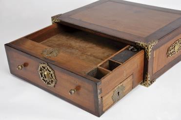 - revestimento parcial a sissó, interior com duas gavetas inclusas, receptáculos para tinteiro e areeiro, receptáculo com tampa em ébano e receptáculo com fechadura, ferragens em cobre dourado