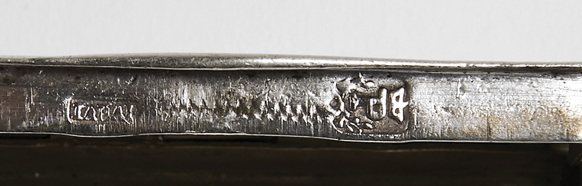 - decoração gravada "Paisagem com casario", marca de ensaiador do Porto (1843-1853), marca de ourives de José de Almeida Brandão Aguiar Penetra (1843-1877)