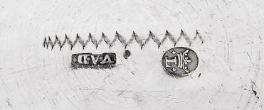 - decoração canelada e pega em pau santo, marca de ensaiador de Lisboa (1870-1879), marca de ourives de Victor Acto Diniz (1822-1879)