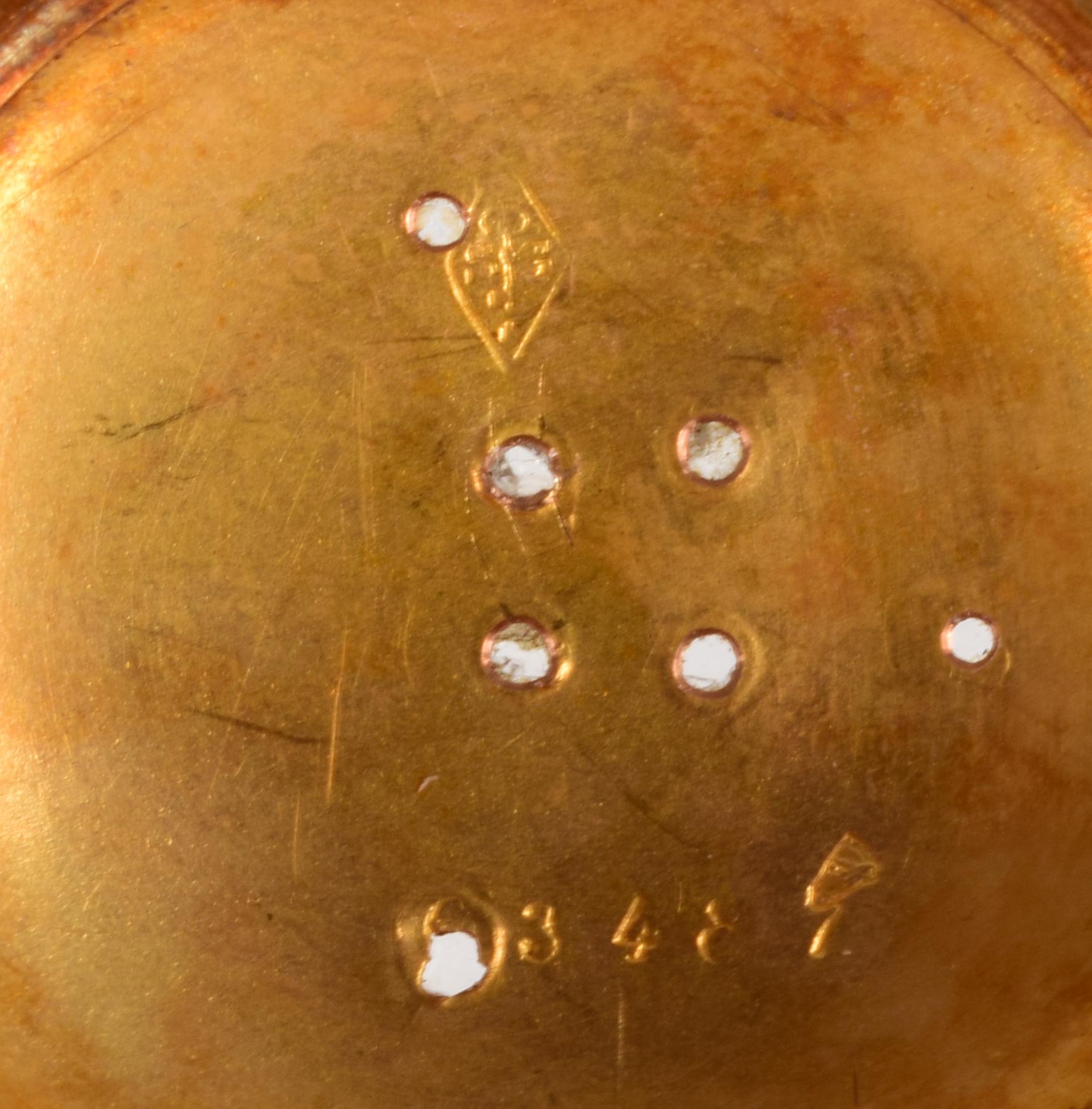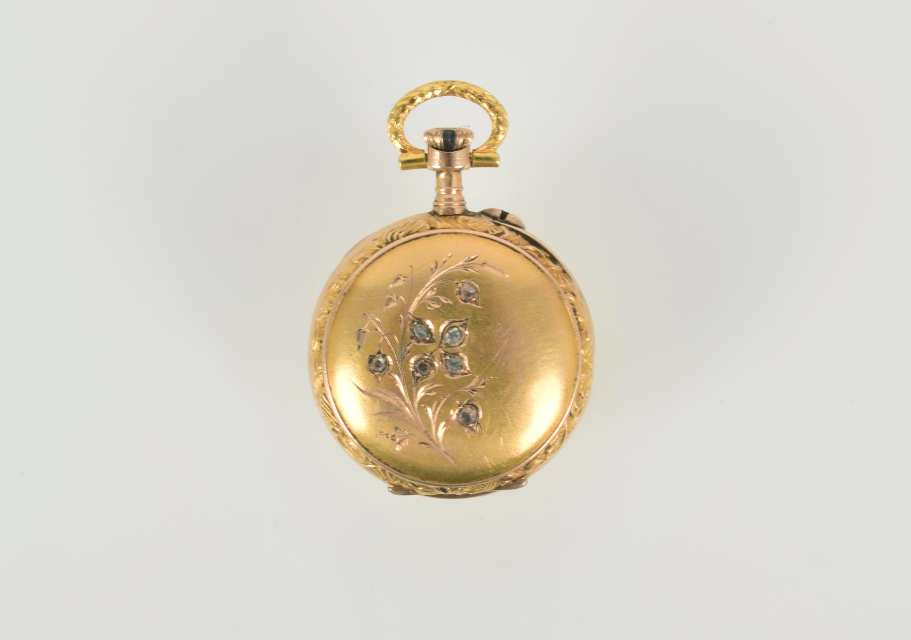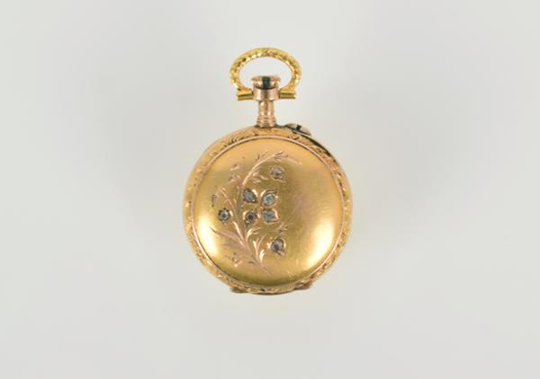 - relógio de lapela, cravejado com diamantes em talhe rosa, movimento mecânico