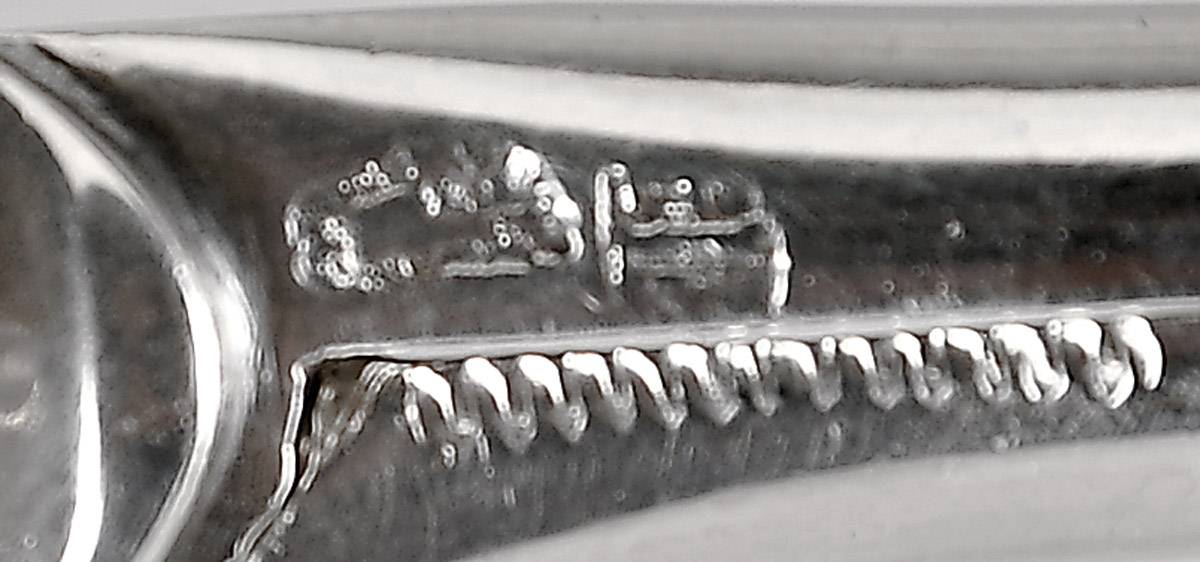 - marca de ensaiador de Braga, marca de ourives de FIM, bandeja de origem francesa, verso também com marca francesa de 1713, tesoura portuguesa