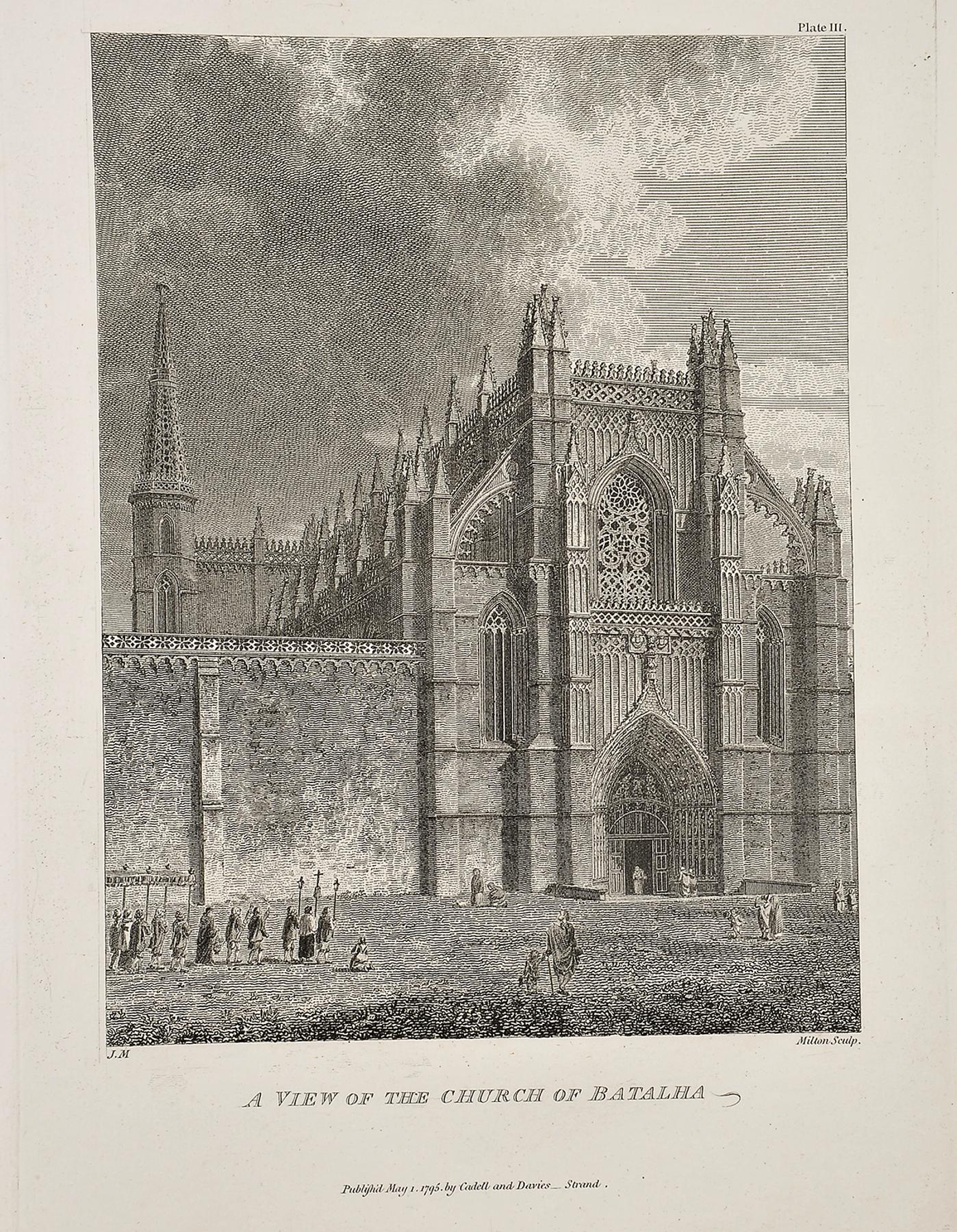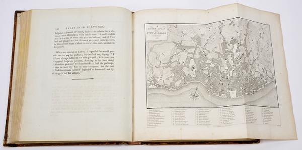 - Travels in Portugal through the provinces of Entre Douro e Minho, Beira, Estremadura and Alem-Tejo in the years 1789 and 1790. Consisting on the manners, customs, trade, public buidings, arts, antiquities, &c. of that Kingdom.- London: Printed for A. Strahan, T. Cadell Jun. and W. Davies, 1795.- XII, 311, [1 br.] p.: XXIV gravuras; 32 cm.- E. James Murphy (1760-1814), arquitecto irlandês, visitou Portugal entre os anos de 1788 e 1790, com o objectivo de estudar e registar em desenho os monumentos e antiguidades do nosso país. A viagem foi patrocinada por William Burton Conyngham, coleccionador, antiquário e mecenas das artes. Edição original ilustrada com 24 gravuras a talhe-doce (não coloridas), representando costumes, monumentos, antiguidades, inscrições e uma planta de Lisboa. Estampa IX, com pequena mancha de cor (aguarela?). De resto, um exemplar limpo e com boas margens. Ex-libris estrangeiro heráldico, com as iniciais RC. Encadernação inteira de vitela, da época, um pouco cansada. Duarte de Sousa, 511. Foulché-Delbosc, 197A.