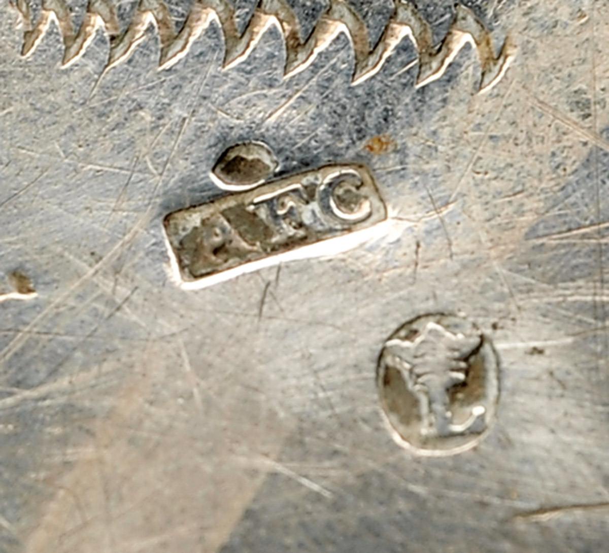 - gravação "Timbre heráldico", interior dourado, marca de ensaiador de Lisboa (1810-1822), marca de ourives de António Firmo da Costa (1793-1824)