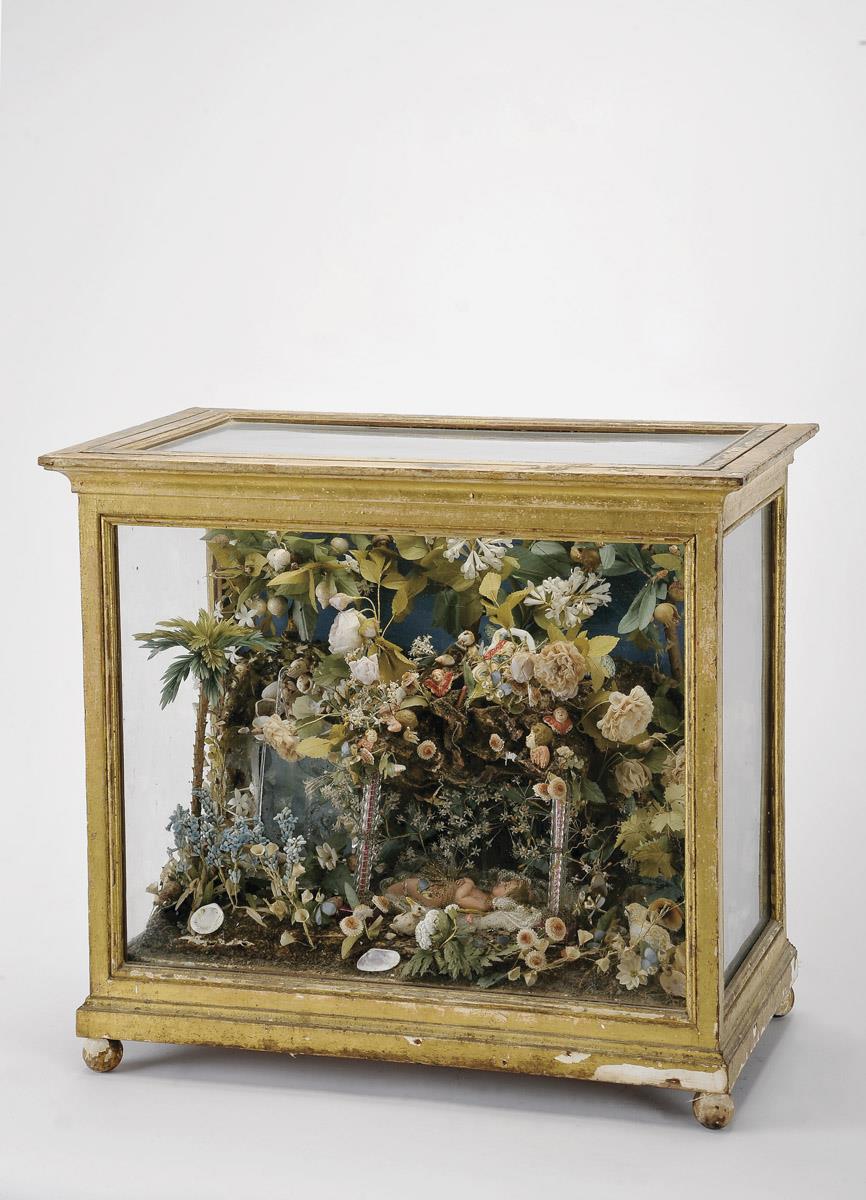 - em madeira, decoração em vidro, tela e conchas ao gosto italiano dentro de maquineta