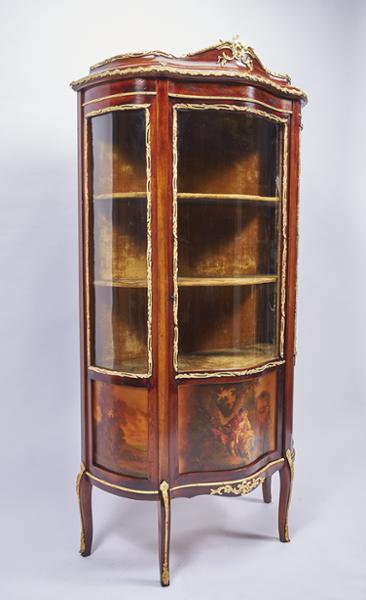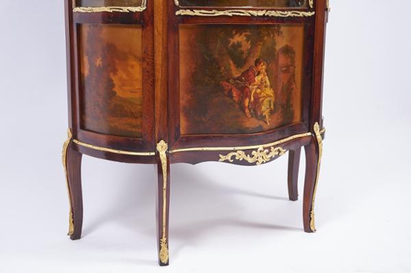 - vidros curvos, painéis em "Vernis Martin" aplicações em bronze, interior forrado a tecido