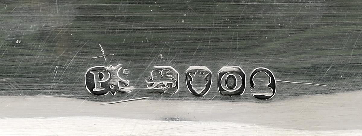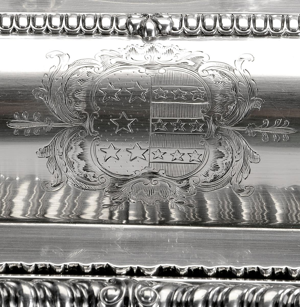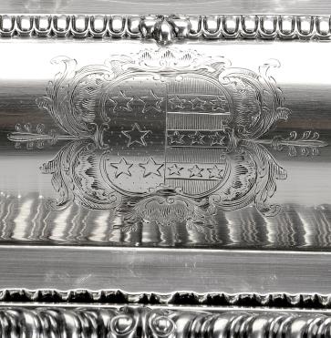 - decoração gravada com escudo partido: 1º Coutinho; 2º Avelar (ou Soveral), bordo relevado e canelado,marca da cidade de Londres (1829-1830), marca de ourives de Paul Storr (1771-1844)