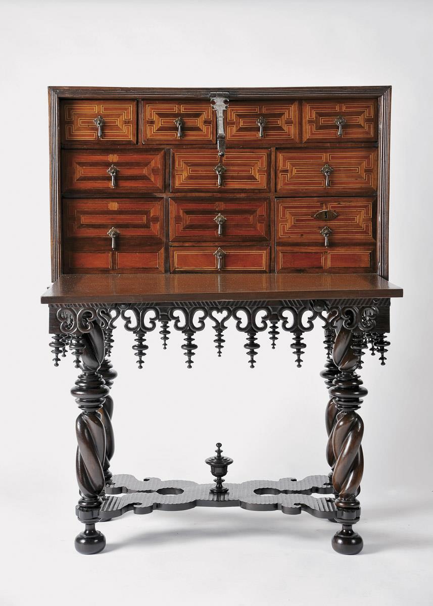 interior com dez gavetas simulando onze, frente das gavetas em pau-santo, vinhático e pau-cetim, ferragens em ferro, trempe em pau-santo