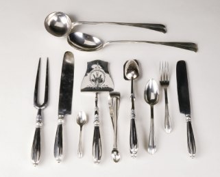 interior forrado a veludo vermelho com galões, portuguesa, séc. XVIII/XIX, restauros, pequenos defeitos, interior com faqueiro "Dog nose" para dozes pessoas em prata, composto por sete talheres de servir, colheres de sopa, talheres de resto, colheres de doce e duas de café, marca de ensaiador de Braga (1814-1829), marca de ourives António José Coelho (1795)