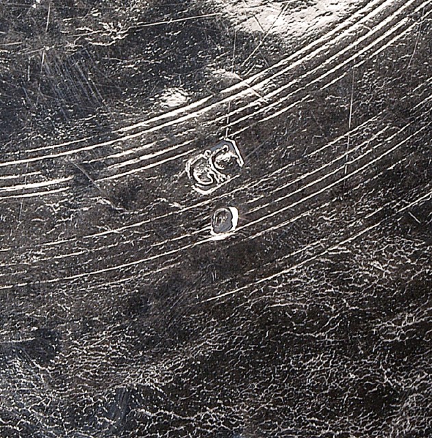 decoração gravada com armas esquarteladas: 1º - Manuel; 2º - Negrão (?); 3º - Vasconcelos; 4º - Silva (?), marca de ourives de G G