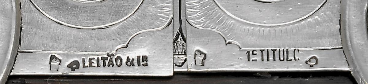 decoração gravada com iniciais L.S.H.B. (D. Luísa Sousa Holstein Beck), contraste Javali de Lisboa (1887-1937), marca de ourives de LEITÃO & IRMÃO
