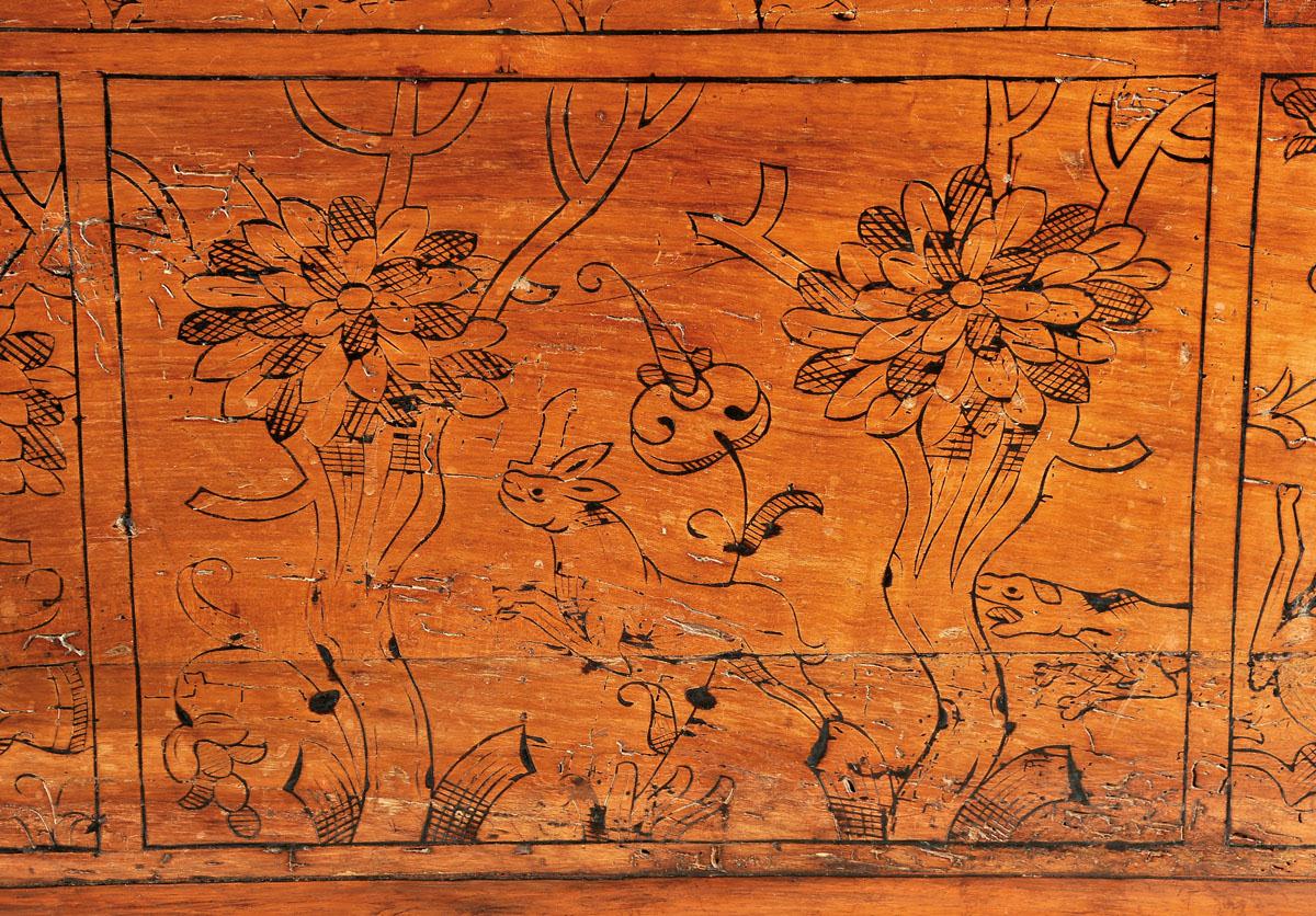 decoração incisa preenchida a massa negra "Cães perseguindo veados, cães, tetrafólios e motivos florais"